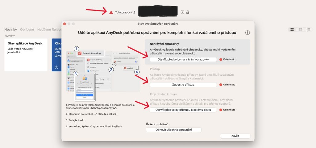 - AnyDesk Vám zobrazí seznam všech chybějících oprávnění (Zpřístupnění, Nahrávání obrazovky, Plný přístup k disku).