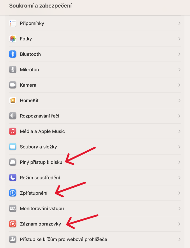 3. Povolení přístupu v sekci Accessibility (Zpřístupnění), Screen Recording (Nahrávání obrazovky) a Full Disk Access (Plný přístup k disku)